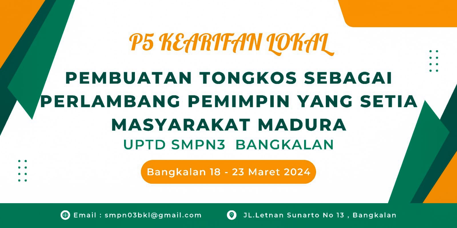 Kegiatan Proyek Penguatan Profil Pelajar Pancasila (P5) dengan Tema Kearifan Lokal dilakukan oleh siswa kelas VIII pada bulan maret 2024 sampai selesai. Dengan Topik Pembuatan Tongkos sebagai perlambangan pemimpin yang setia masyarakat madura.