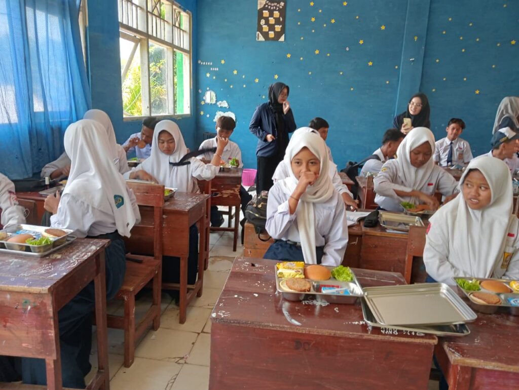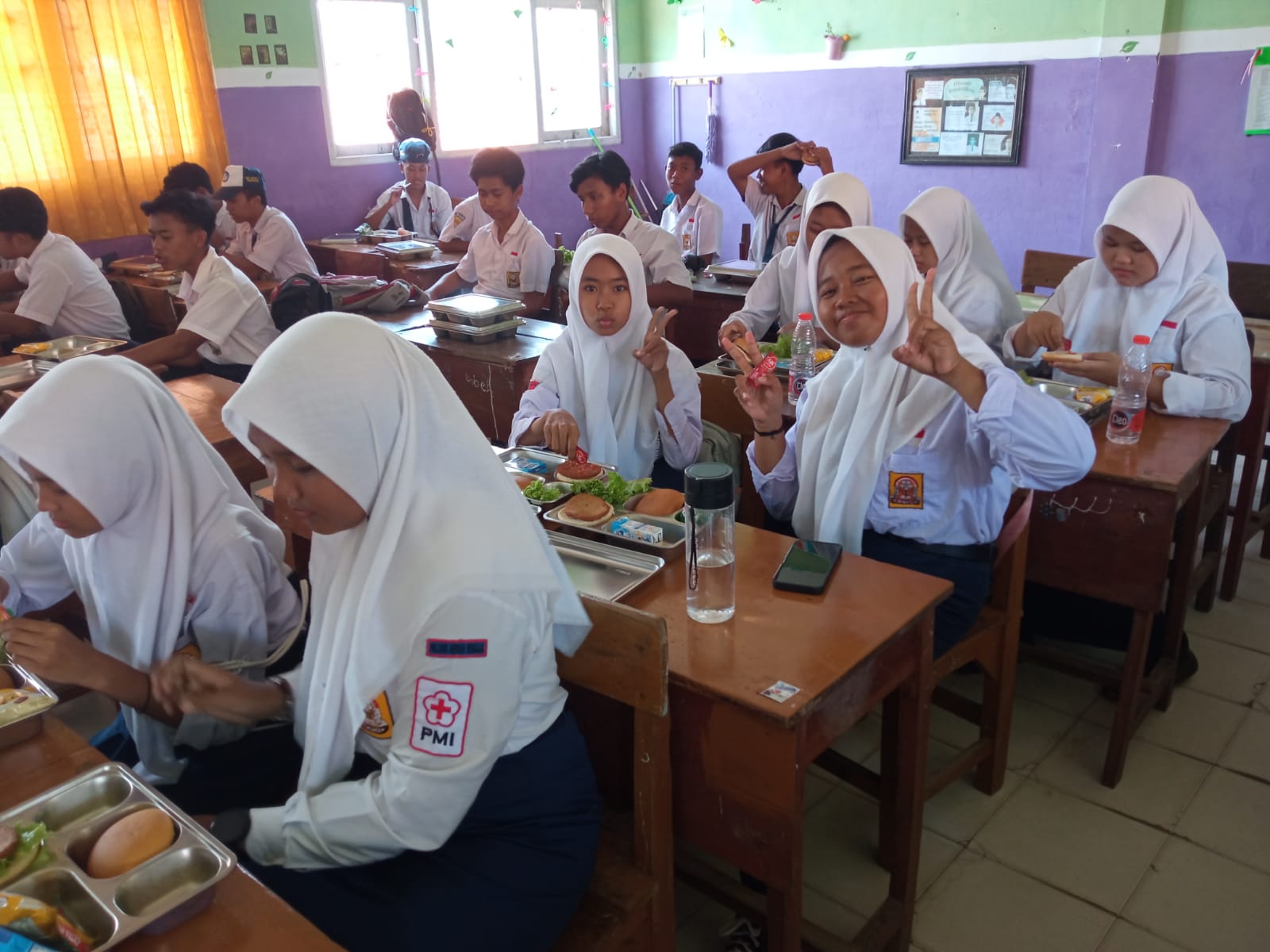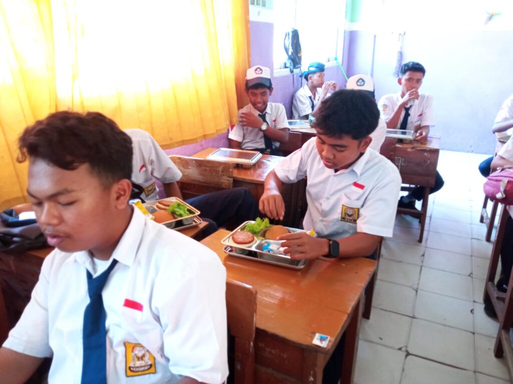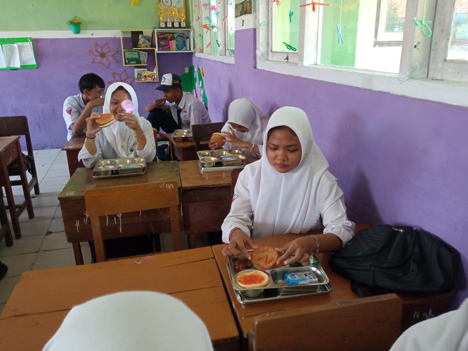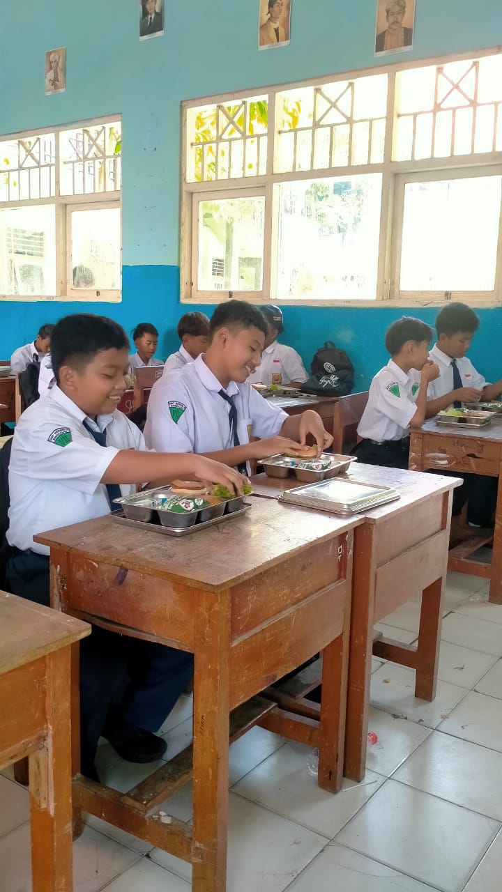 Kegiatan MBG berlangsung di kelas masing-masing dengan pembagian makanan yang dilakukan secara tertib dan terintegrasi. Setiap kelas mengirimkan perwakilan siswa untuk mengambil makanan ke pos pembagian yang terletak di samping ruang Tata Usaha (TU), lalu membawanya kembali ke kelas. Di kelas, para wali kelas mendokumentasikan kegiatan MBG perdana ini. Setelah selesai makan, perwakilan kelas juga ditugaskan untuk mengembalikan wadah makanan agar kegiatan berjalan rapi dan terkoordinasi. Hari ini terdapat enam sesi pelaksanaan sehingga semua siswa dapat menikmati makanan dengan nyaman.