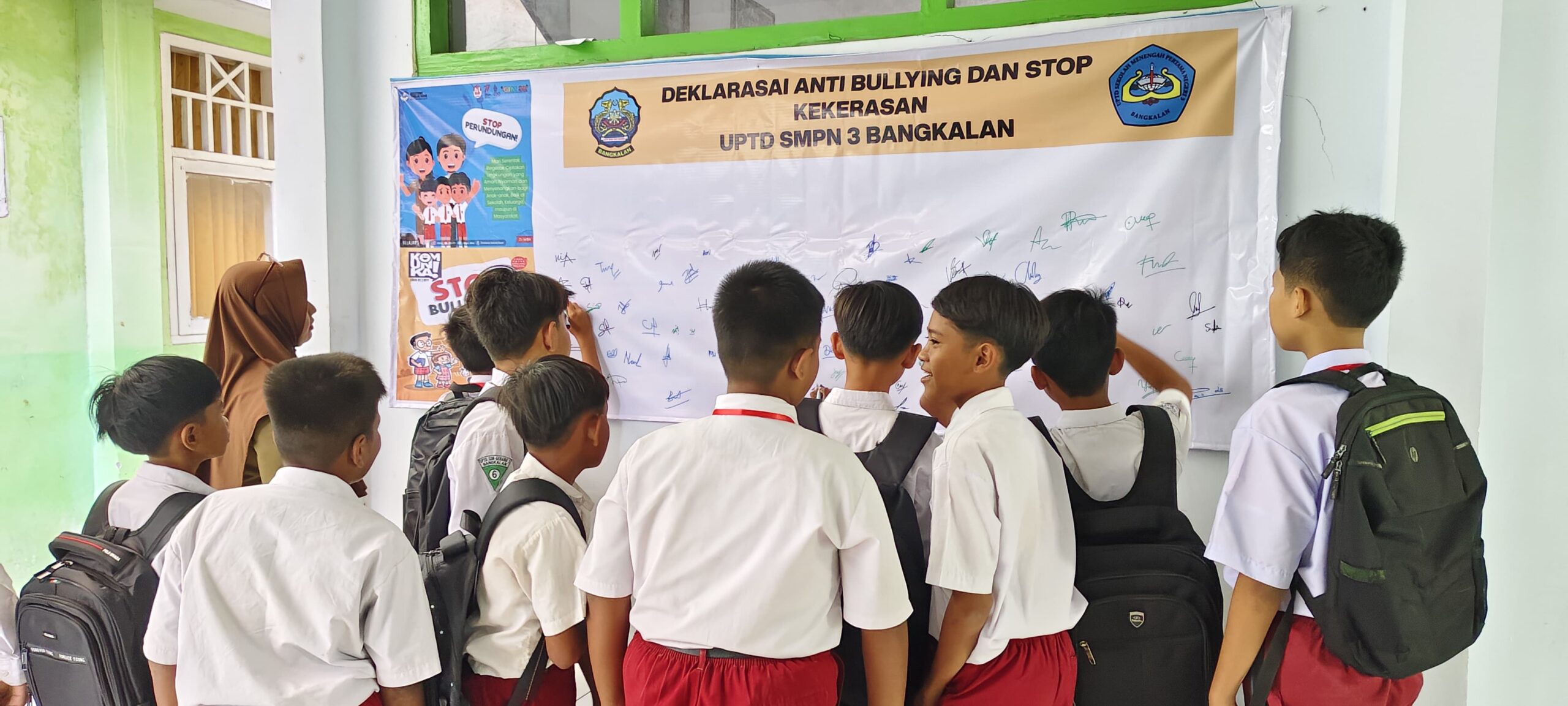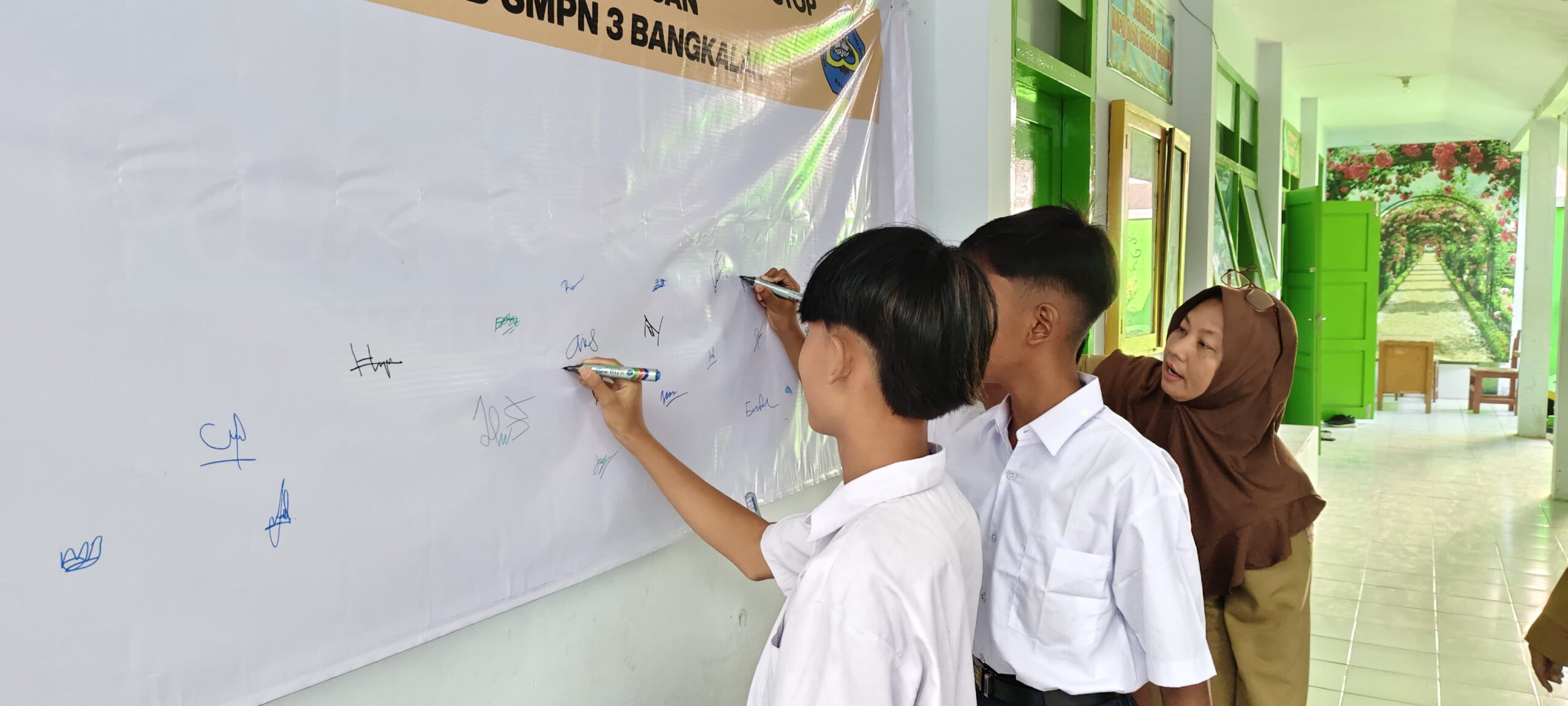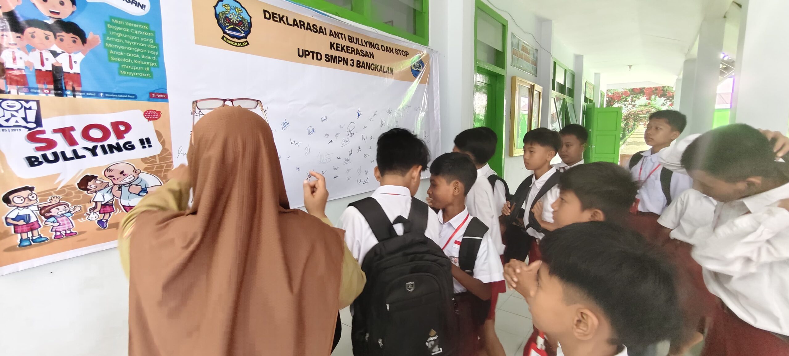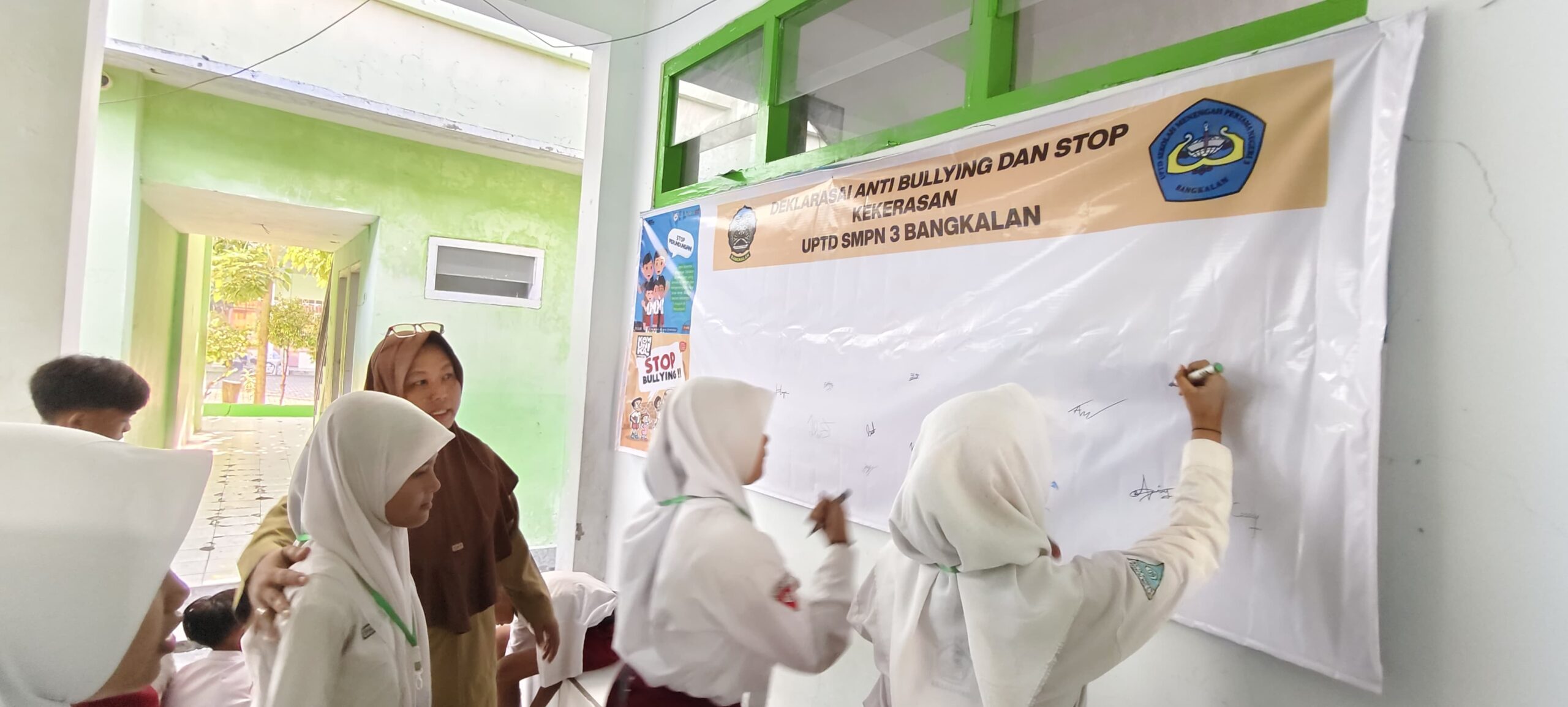 Acara selanjutnya adalah penyematan atribut sekolah. Perwakilan peserta MPLS yang ditunjuk yaitu dua orang siswa dari peserta MPLS untuk maju sebagai perwakilan penyematan atribut sebagai pertanda disahkannya menjadi peserta didik di SMP Negeri 3 Bangkalan dengan diikuti peserta didik lainnya.